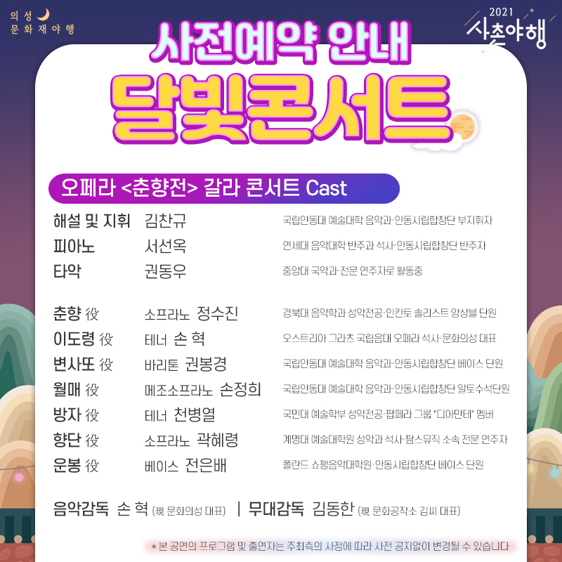 아름다운 전통 한옥과 고품격 클래식의 조화는 그동안 코로나19로 지쳐있던 우리들의 마음을 위로해줄 특별한 시간이 될거예요. 특히 사촌야행을 위해 새롭게 각색된 오페라 <춘향전> 갈라 콘서트는 공연의 완성도를 높이기 위해 의성의 음악감독 및 테너 손 혁(이도령 役, 現 문화의성 대표)을 필두로 국내외에서 인정받은 실력파 청년 음악가들이 만나 멋진 하모니를 완성할 예정입니다. 사랑의 아리아로 물들 낭만적인 사촌의 밤을 기대해 주세요!