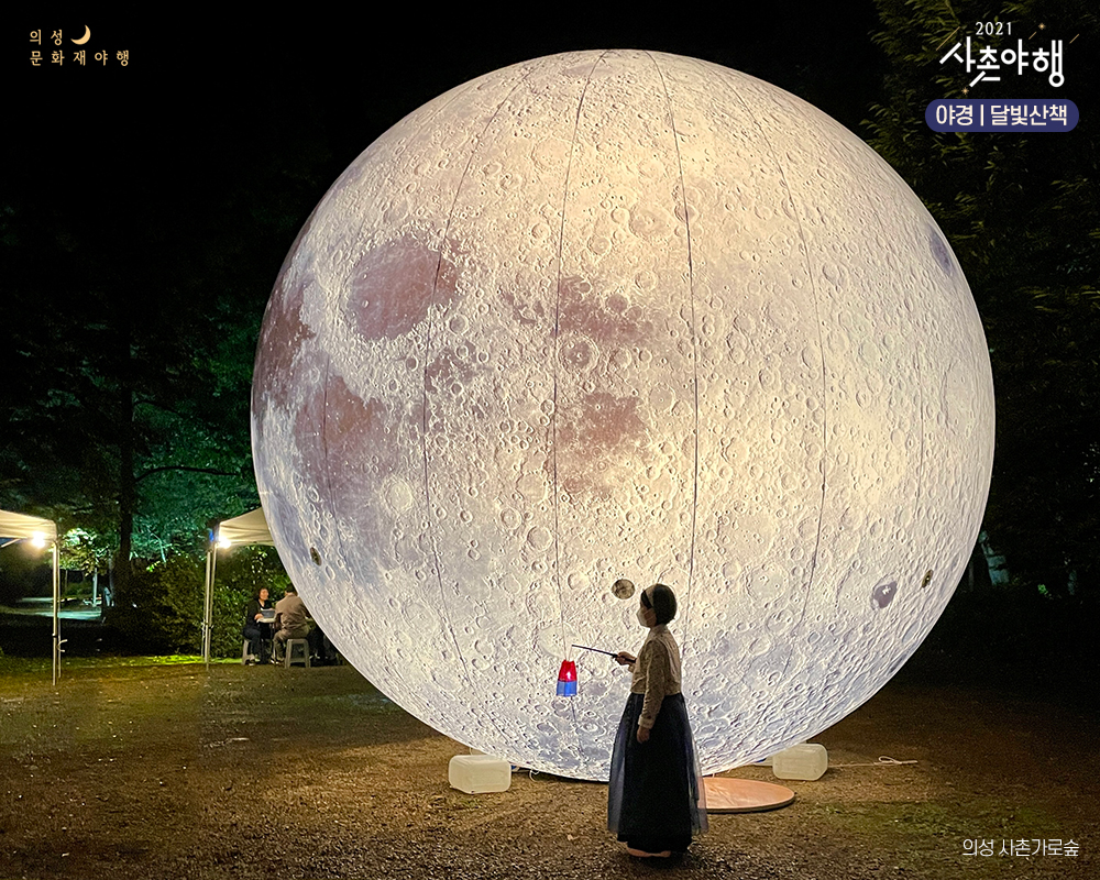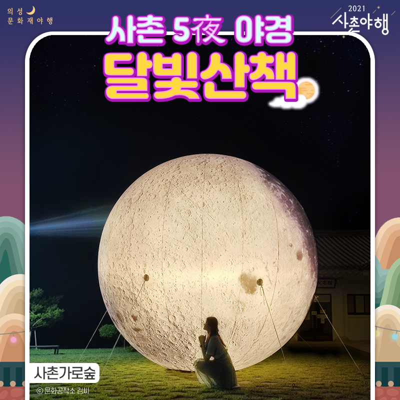특히 <사촌야행> 기간 동안 사촌가로숲을 비롯한 사촌마을 돌담길 등 마을 일대가 아름다운 조명으로 더욱 아름답게 빛날 예정이에요. 불빛을 따라 걷다보면 색다른 추억을 만들 수 있을 거예요. 낮과 다른 밤의 사촌가로숲은 어떤 신비함을 간직하고 있을지? 오랜시간 마을을 지켜준 울창한 나무들 만큼이나 커다란 달 포토존에서 인생샷도 남겨보세요!