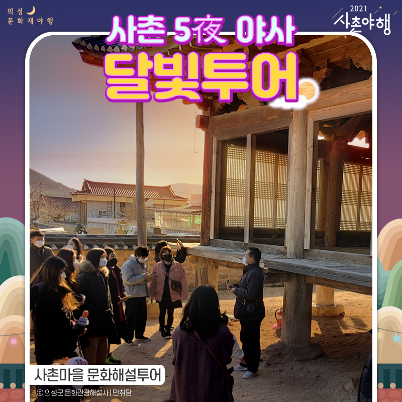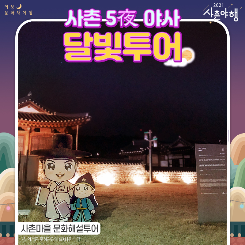여름엔 처마 밑으로 떨어지는 빗소리에 취하고, 겨울엔 담장 위로 쌓이는 눈소리에 잠 드는 곳. 매일 밤 별이 쏟아지는 사촌마을에서 언제든 마음 편히 머물다 가세요. 특히 <사촌야행> 기간 동안 야간 문화해설투어가 진행됩니다. 600년의 역사가 잠든 사촌마을에 한걸음 더 가까워지는 시간! 의성군 공식 문화관광해설사와 함께 소담한 반촌을 거닐어 보세요.